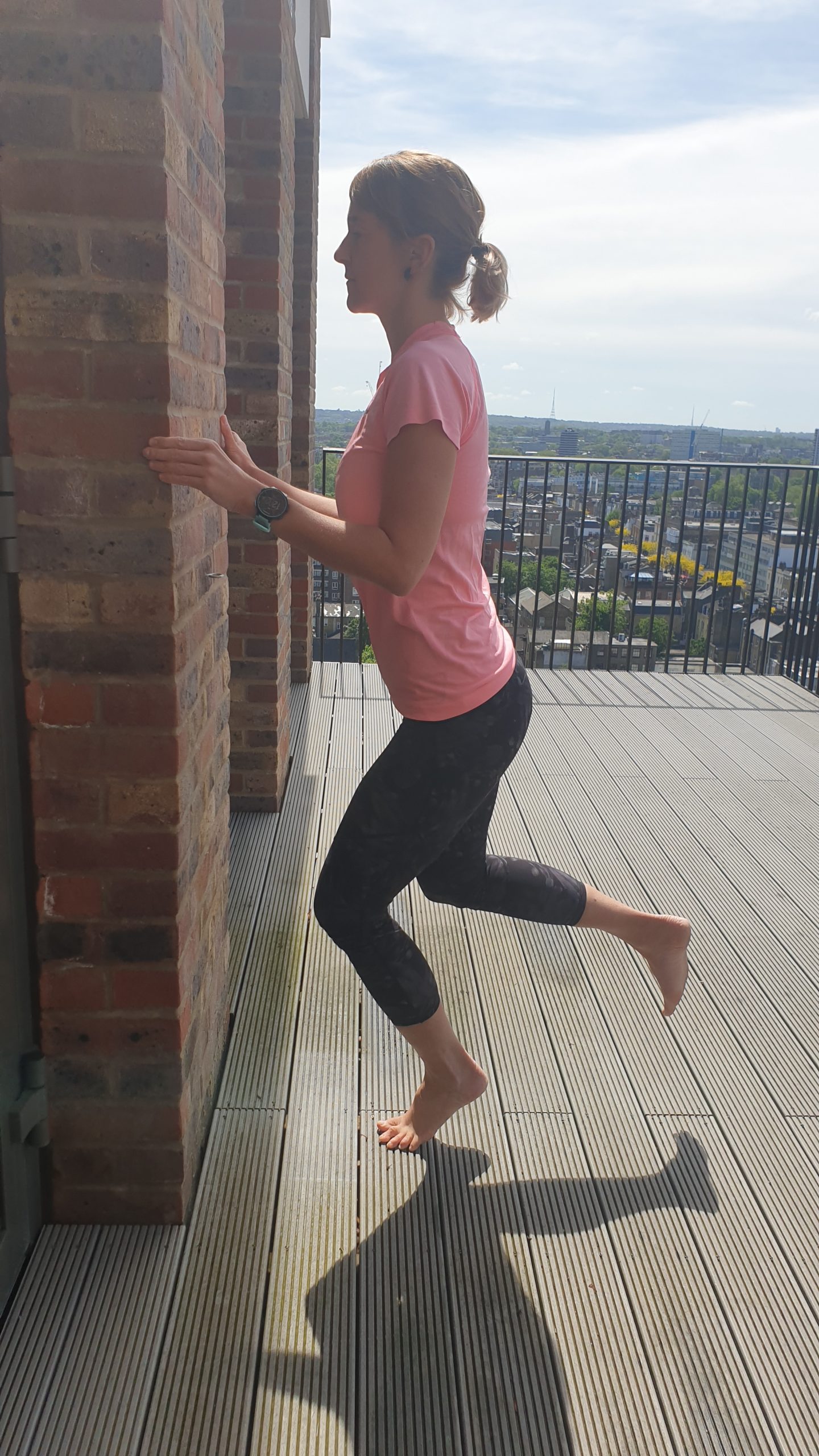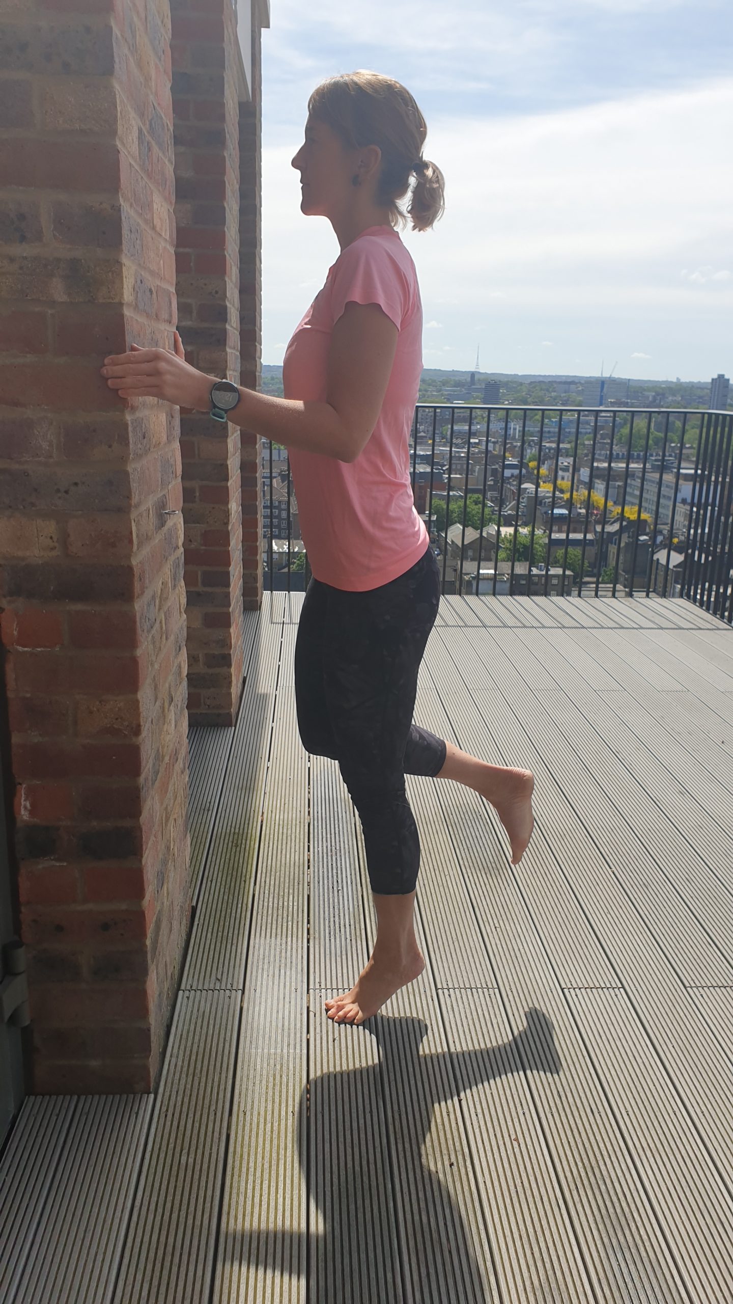 Bend knee 20-30degrees vary this Push up onto tiptoe Keep hips and shoulders square onto the wall Slowly lower 30 repetitions is a good target to aim for, if not possible build this up over a number of weeks then maintain.