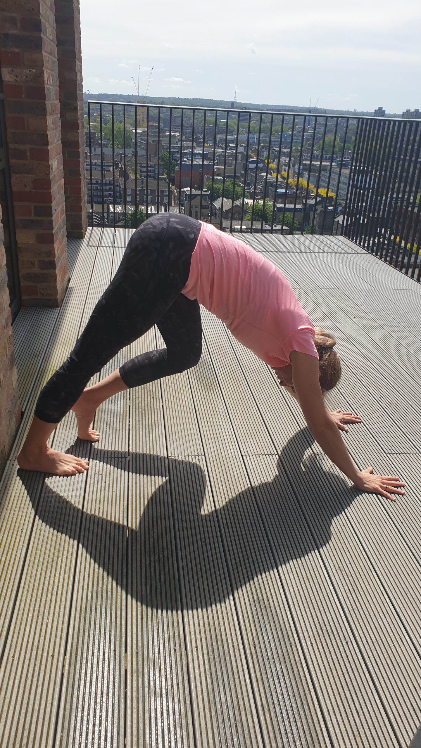 Pushing one-foot heel into the floor Hips high Upper back extended Hold this position for 40 seconds then switch sides