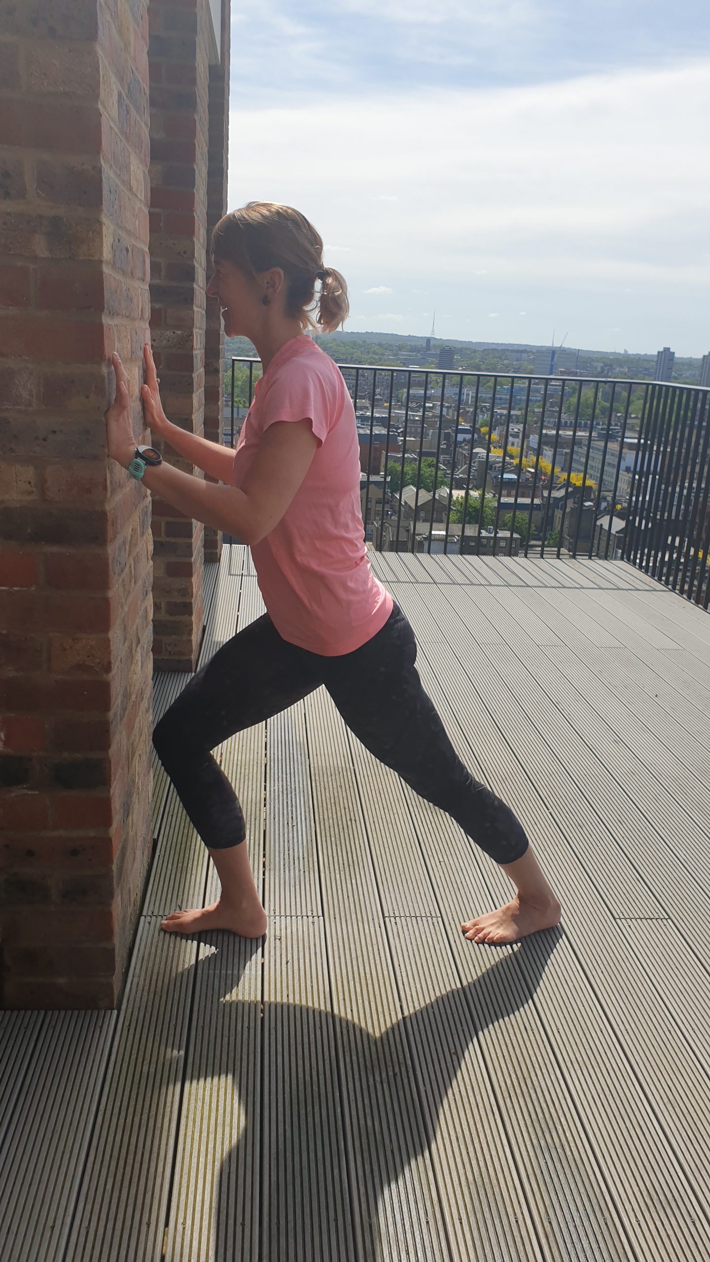 Straight leg squeeze quadriceps muscles Push up on tiptoe Keep hips square onto the wall Push straight up 30 repetitions is a good target to aim for, if not possible build this up over a number of weeks then maintain.
