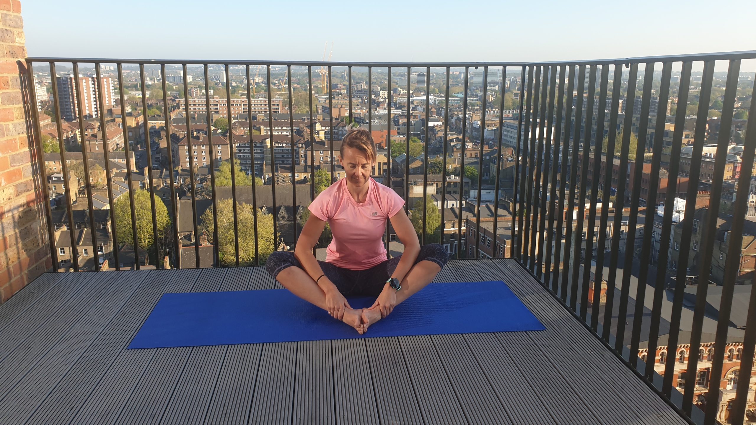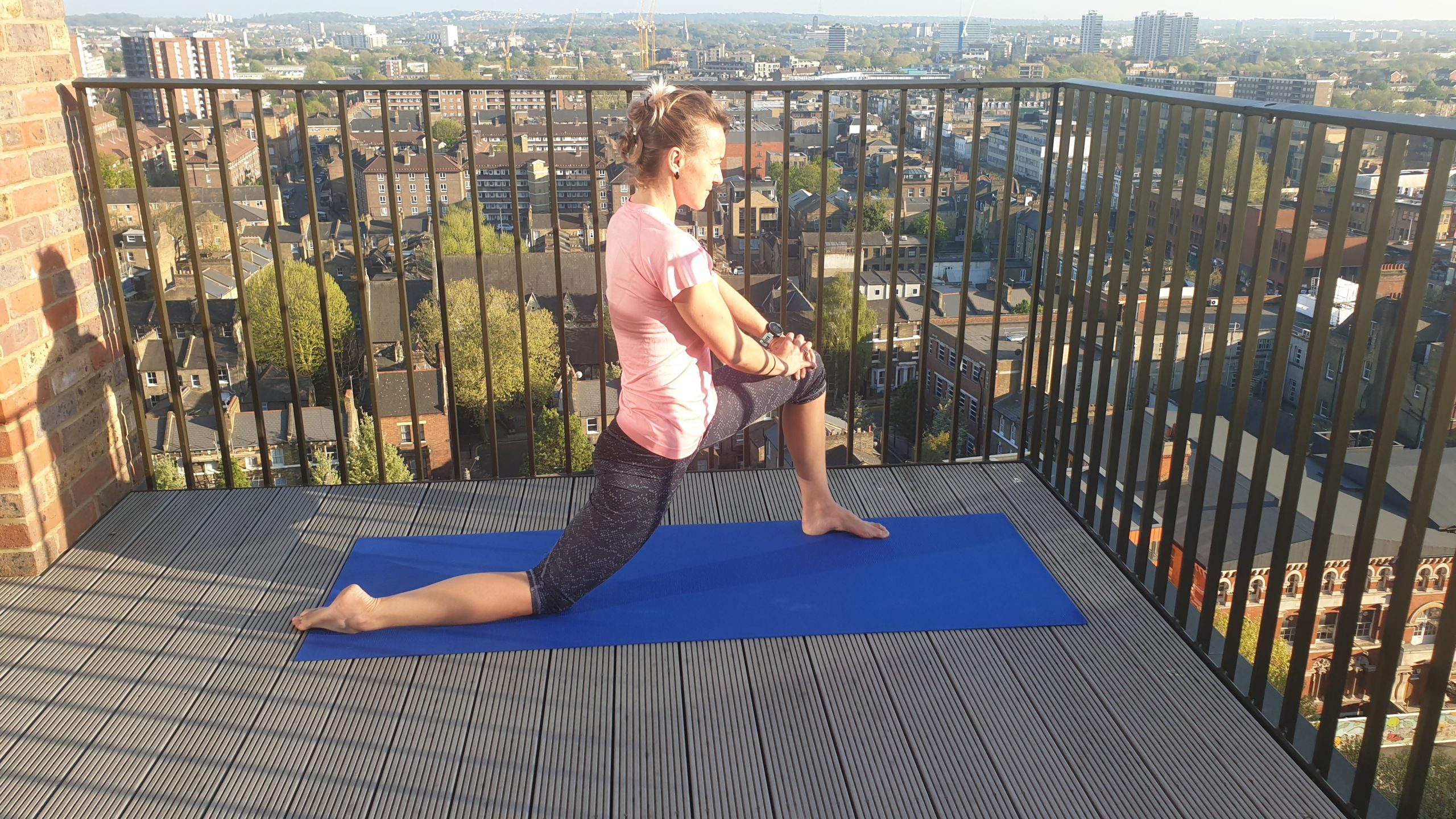 – Reach behind to grab hold the ankle of the top leg and pull it back behind you