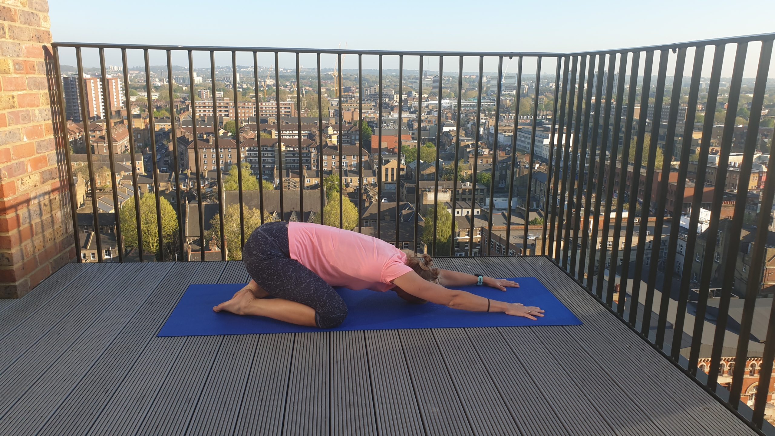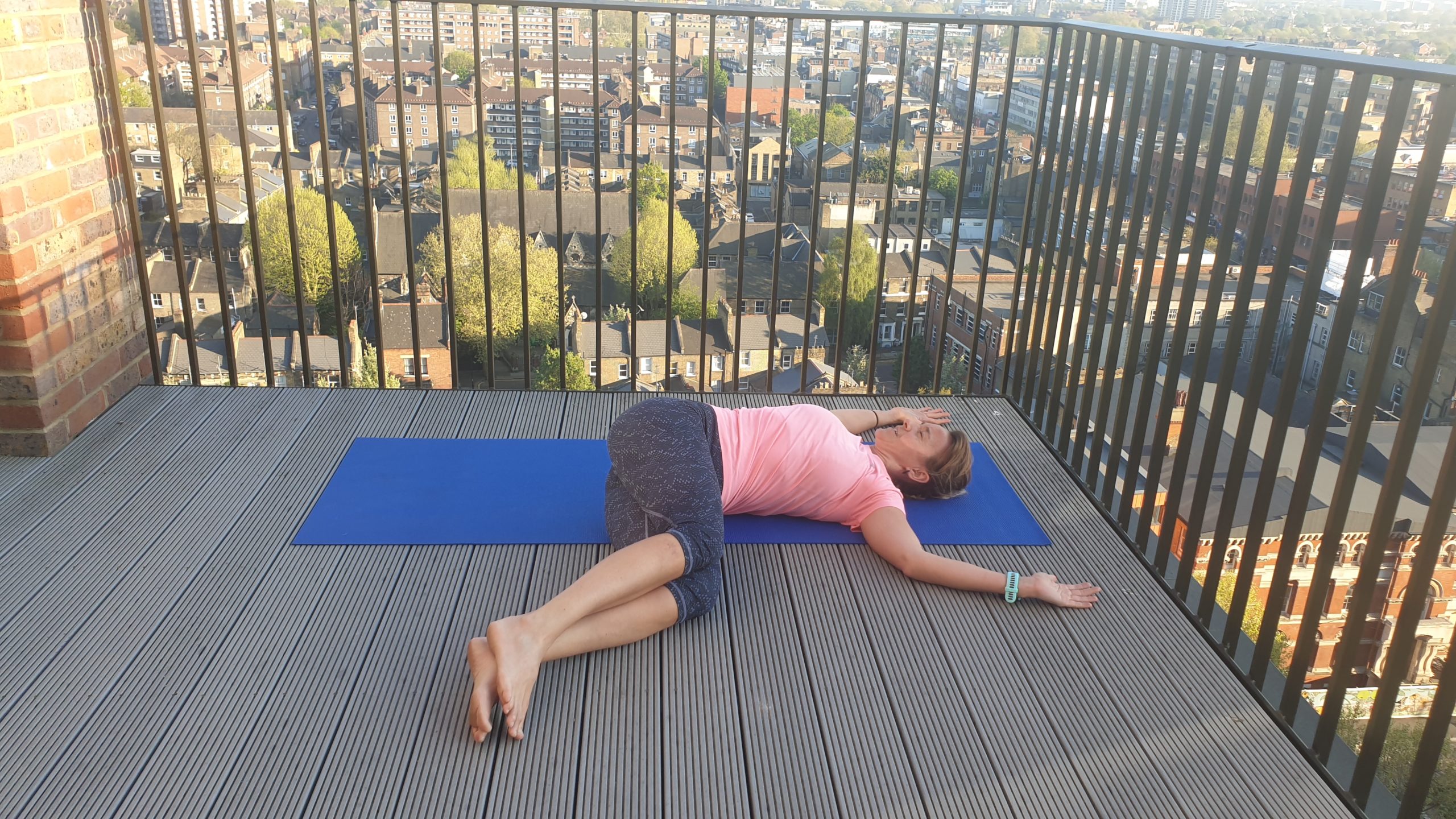 Breathing, inhale through the nose and exhale through pursed lips during a stretch. You may wish to close your eyes to increase concentration and awareness during the lying stretches.
